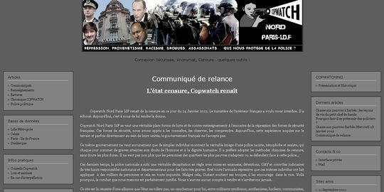 « Copwatch renaît de ses cendres. Bloqué en 2011 après un référé du ministre de l’intérieur, le site Internet de fichage des policiers, qui revendique une lutte « par l’information contre les violences policières », a été réactivé mardi 24 janvier, suscitant des réactions syndicales policières « indignées ». Sur son site, Copwatch Nord-Ile-de-France, qui a désormais une nouvelle adresse, a annoncé mardi qu’il « renaît de la censure » : « Le ministère de l’intérieur français a voulu nous interdire. Il a échoué. » Il précise vouloir à nouveau lutter contre « la répression des forces de sécurité françaises ». (via Fichage des policiers : le site Copwatch réactivé après avoir été bloqué par la justice – LeMonde.fr)