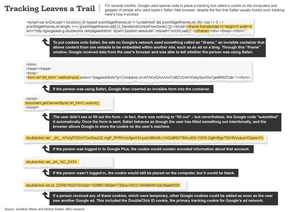 Google’s P3P policy causes Internet Explorer to accept Google’s cookies even though the policy does not state Google’s intent.