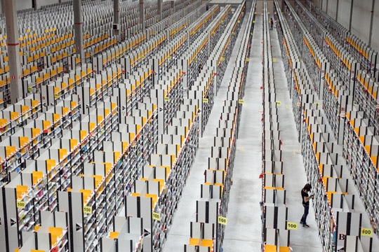 « La particularité du centre de logistique vient du système de stockage des marchandises : ces dernières ne sont pas rangées par thème mais plus ou moins par taille et remplissent des kilomètres d’étagères à hauteur d’homme. Chaque produit est précisément géolocalisé à l’aide d’un code barre qui sera associé à une « bin » (petite zone de stockage) ». (via Dans les coulisses d’Amazon France à Saran | Zerobug)