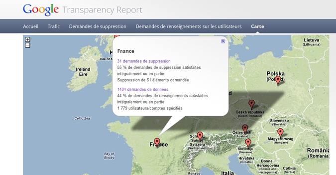 « Le nombre des demandes de renseignements sur les utilisateurs a progressé, passant en France à 1 779 internautes concernés sur le dernier semestre 2011, contre 1552 dans la période précédente. « Le nombre de demandes que nous recevons concernant des informations liées aux comptes utilisateurs dans le cadre d’enquêtes criminelles augmente d’année en année. Cette augmentation n’a rien de surprenant, car nous offrons chaque année davantage de produits et de services, et nous disposons d’un grand nombre d’utilisateurs », nuance Google. En revanche, la firme n’a accédé qu’à 44 % de ces demandes françaises, contre 47 % auparavant ». (via Google dénonce un niveau “alarmant” de censure gouvernementale)