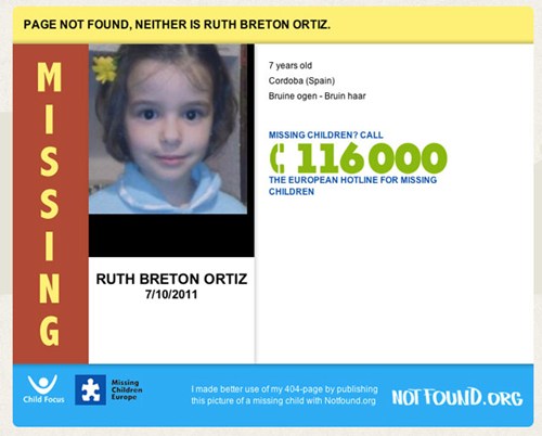« NotFound.org is a European effort to replace 404 pages with missing child alerts like these. Which is a noble cause, but it also feels like the internet version of a Sarah McLachlan animal abuse commercial ». (via World’s Most Bizarrely Unorthodox Way To Help Save Missing Children | Happy Place)