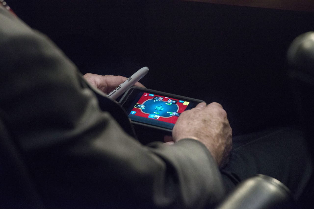 Senator John McCain plays poker on his iPhone during a U.S. Senate Committee on Foreign Relations concerning the use of force in Syria, on Capitol Hill in Washington DC, Tuesday, September 3, 2013. (via McCain playing poker on his iPhone)