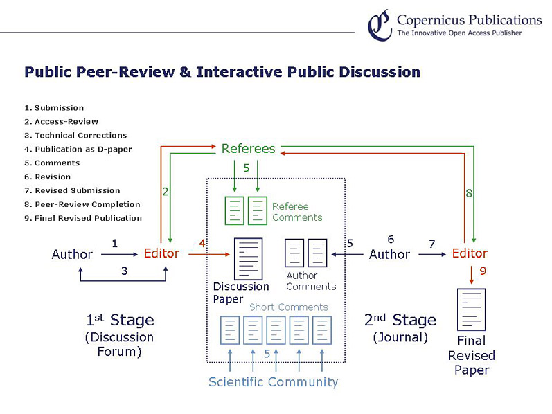 « To foster scientific discussion and to enhance the effectiveness and transparency of scientific quality assurance, Copernicus Publications started in 2001 with an innovative two-stage publication process containing the Public Peer-Review. These interactive journals comprise of the fully peer-reviewed journal itself and an access-reviewed discussion forum ». (via Copernicus Publications – Public Peer-Review)