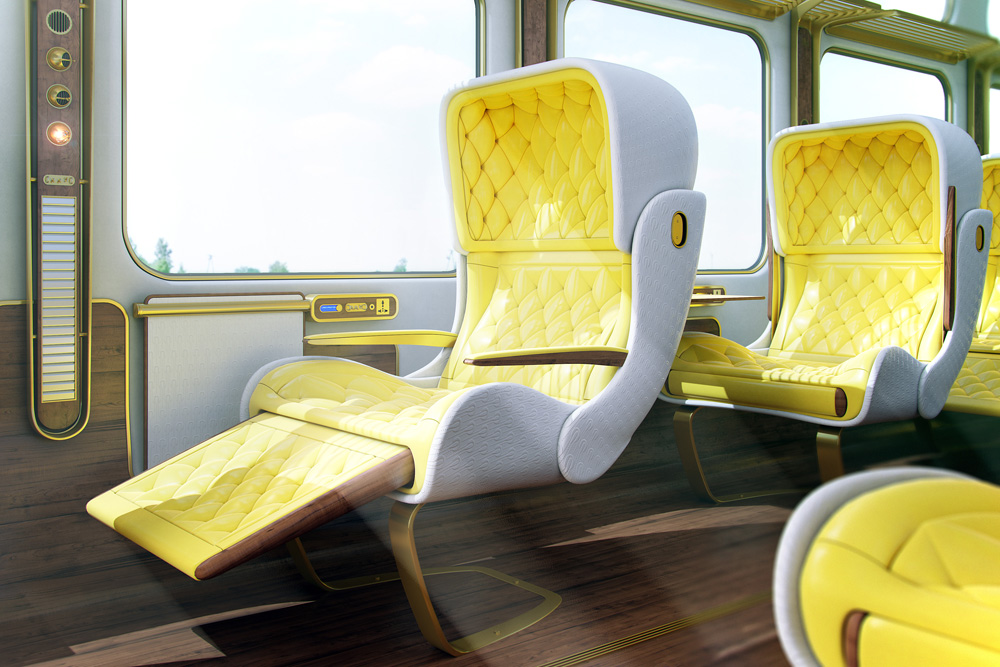 « This commission is a vision of the future of train travel. With transport set to play an ever more important role in the way we communicate with our environment it needs to reflect the values of a changing world. Greener consideration, care for comfort and a dedication to design and luxury. This design pays a homage to the golden age of travel while firmly capturing the spirit of the future. The carriage finished in hardwood, brushed Brass and Carbon fibre illustrates a hybrid of the old and new. Individual accommodation in single seats provides essential armrest services ( air, power, connection ) and retractable privacy, while large screen windows open a view to the World flying by. This is an emotive design, playing to the magic of travel and a respect for the passenger ». (via Christopher Jenner | Projects)