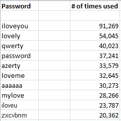 « top 10 non-numeric passwords are probably typical for a dating site, but still horrible nonetheless ». (Cupid Media Hack Exposed 42M Passwords — Krebs on Security)