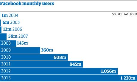« By the end of 2013, Facebook boasted 1.23bn monthly active users worldwide, adding 170m in just one year. According to Facebook, 757m users log on to Facebook daily, as of 31 December 2013 ». (via Facebook: 10 years of social networking, in numbers | News | theguardian.com)