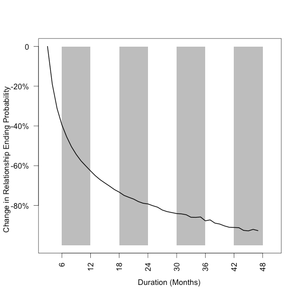 « Confirming our basic intuition of decreasing likelihood of a relationship ending as the relationship’s prior duration grows » (via Flings or Lifetimes? The Duration of Facebook Relationships)