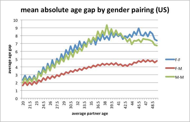 « Interestingly, despite not having this cultural bias to deal with, the average absolute age difference between same-sex partners is larger ». (via The Age of Love)