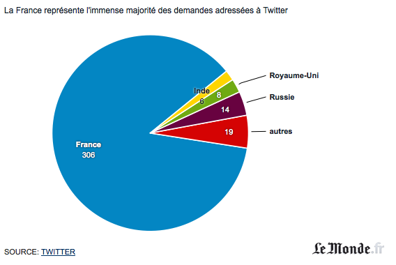 « La France représente l’immense majorité des demandes adressées à Twitter. Le réseau social précise sur son site que « plus de 300 demandes » émanent d’une « association nationale » et concernent des contenus « illégaux et discriminatoires » ». (via La France, numéro un mondial des demandes de suppression de tweets)