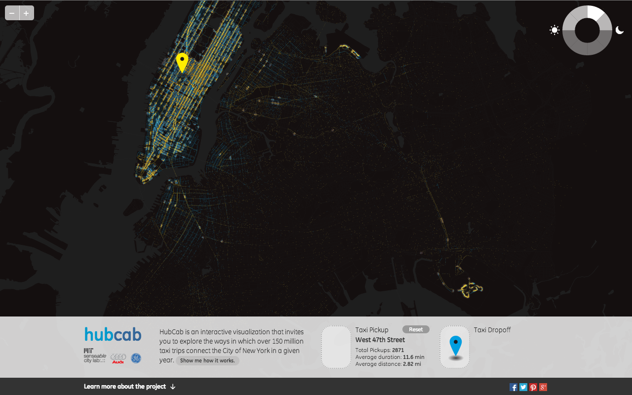 « Screenshot of HubCab, showing pickups and drop offs of all 170 million taxi trips over one year in New York City ». (via HubCab | MIT Senseable City Lab)