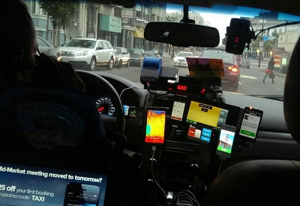 (via Thomas Purves @tpurves Signs we have reached peak-app? Cabbie in SF running 5 dash mounted phones)