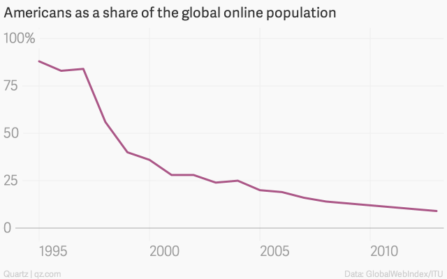 « GlobalWebIndex estimates that over 400 million people in the worldwide log on using virtual private networks (VPNs) that obscure their true location. Another 400 million-odd remain uncounted because they share devices, and more than 150 million aren’t counted because they access the web from mobile devices only, avoiding traditional tracking techniques such as cookies ». (via Hey America, you’re not as important as you think (at least on the internet) – Quartz)