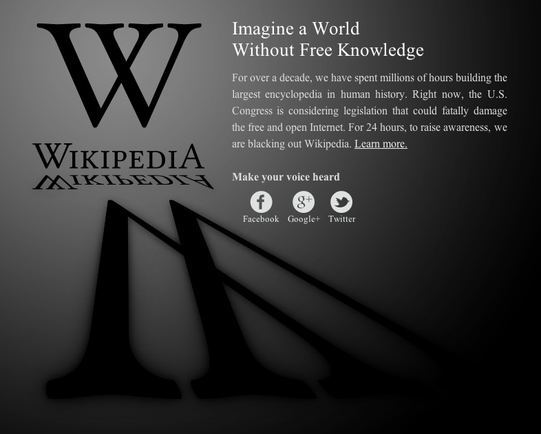 Wikipedians have chosen to black out the English Wikipedia for the first time ever, because we are concerned that SOPA and PIPA will severely inhibit people’s access to online information. This is not a problem that will solely affect people in the United States: it will affect everyone around the world.